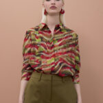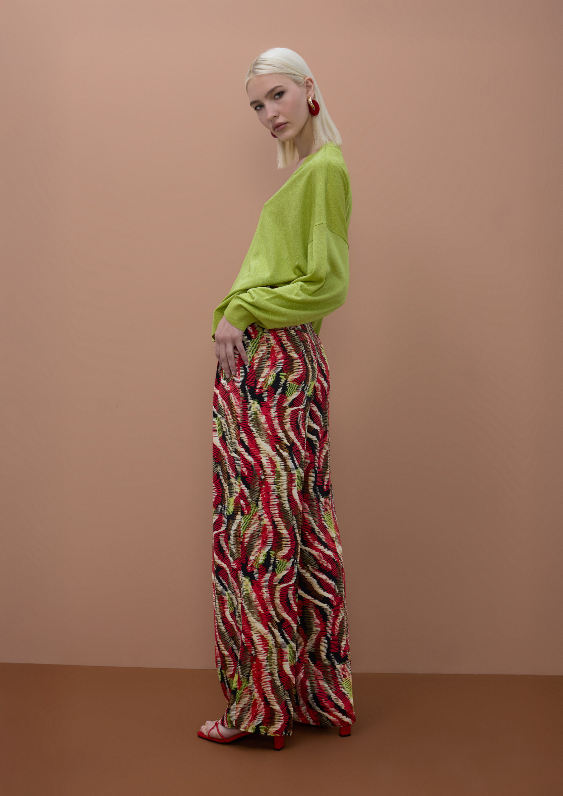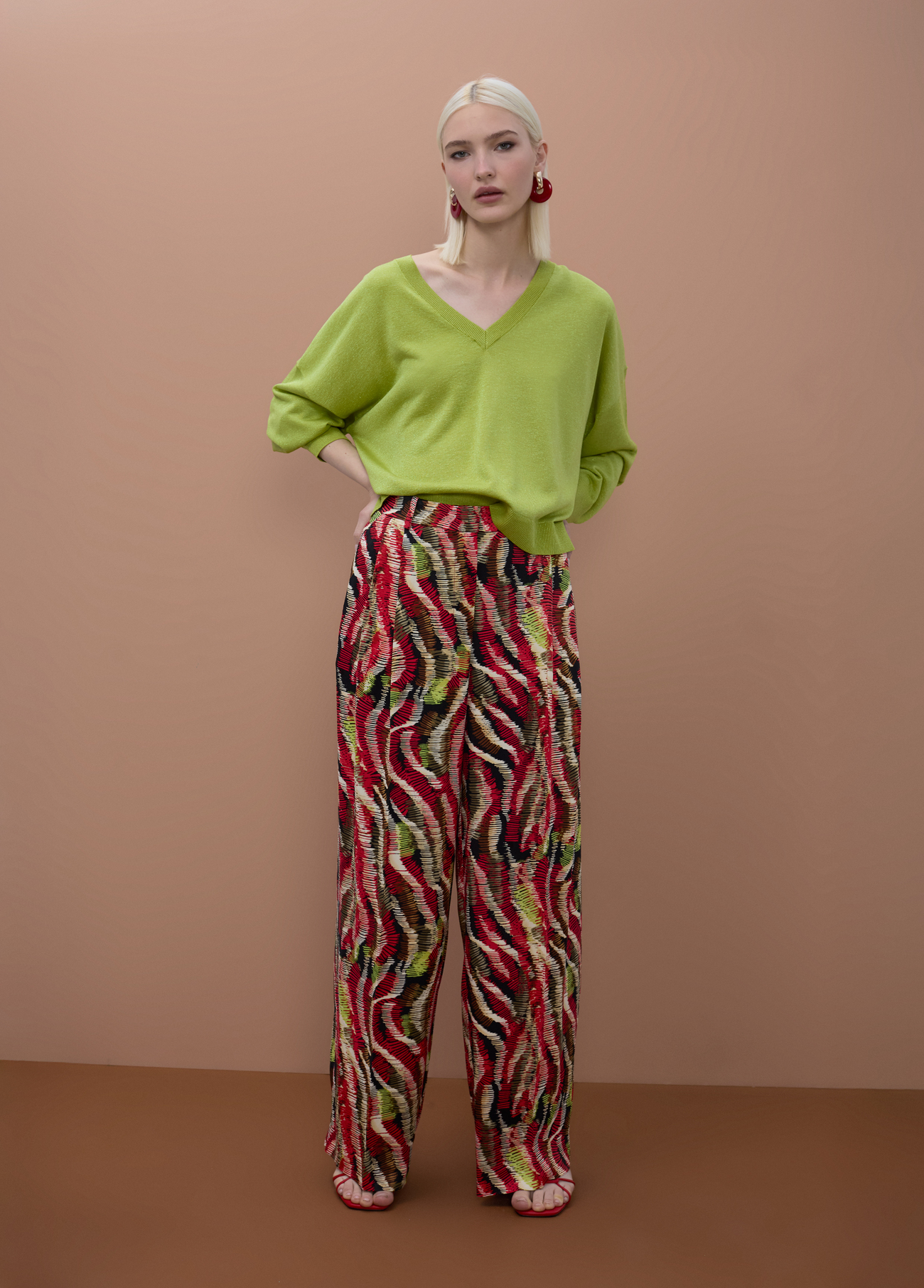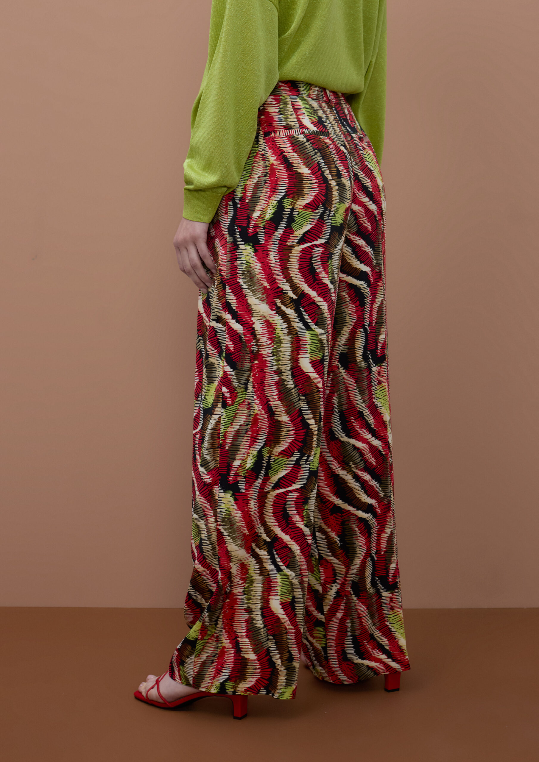 Como vemos nas imagens, as calças funcionam perfeitamente quando coordenadas com cores presentes no padrão. Combiná-las com uma malha de decote em “V” em tom verde lima cria um visual equilibrado, mas cheio de personalidade. Finalizar com sandálias de tiras finas em vermelho acentua a sofisticação do conjunto.