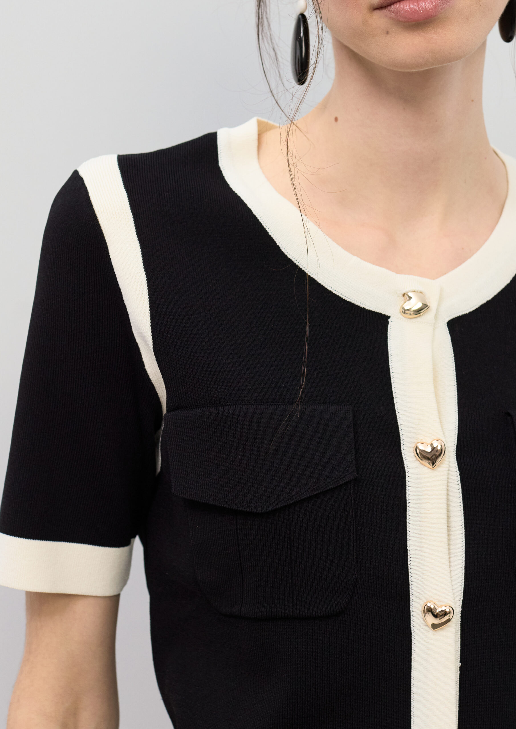 Este cardigan de manga curta redefine o conceito de básico sofisticado. Confeccionado num tricot de toque macio e caimento estruturado, a peça apresenta um contraste gráfico em preto e branco que remete à elegância atemporal da alfaiataria francesa, mas com a leveza necessária para o dia a dia.