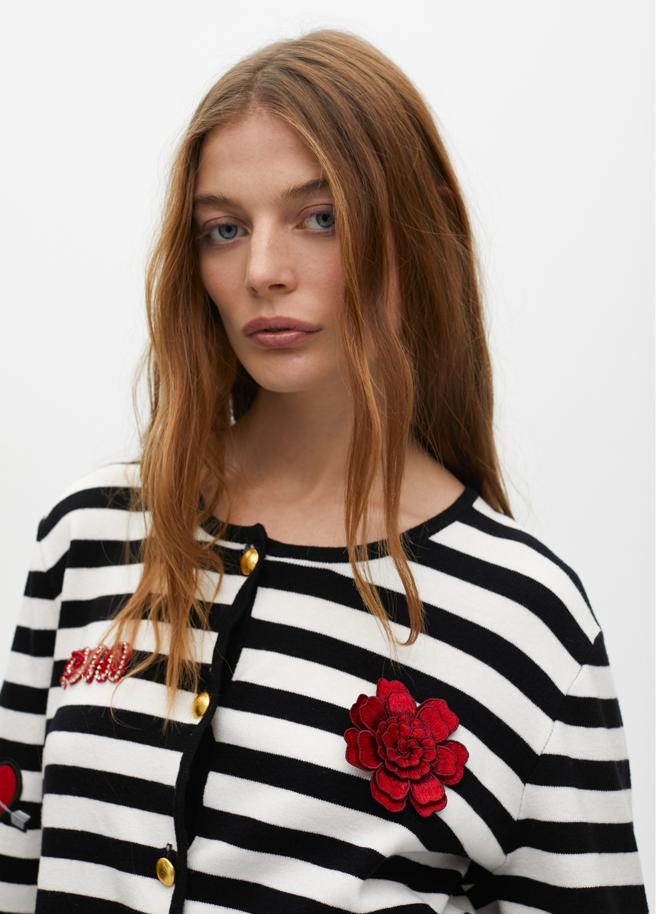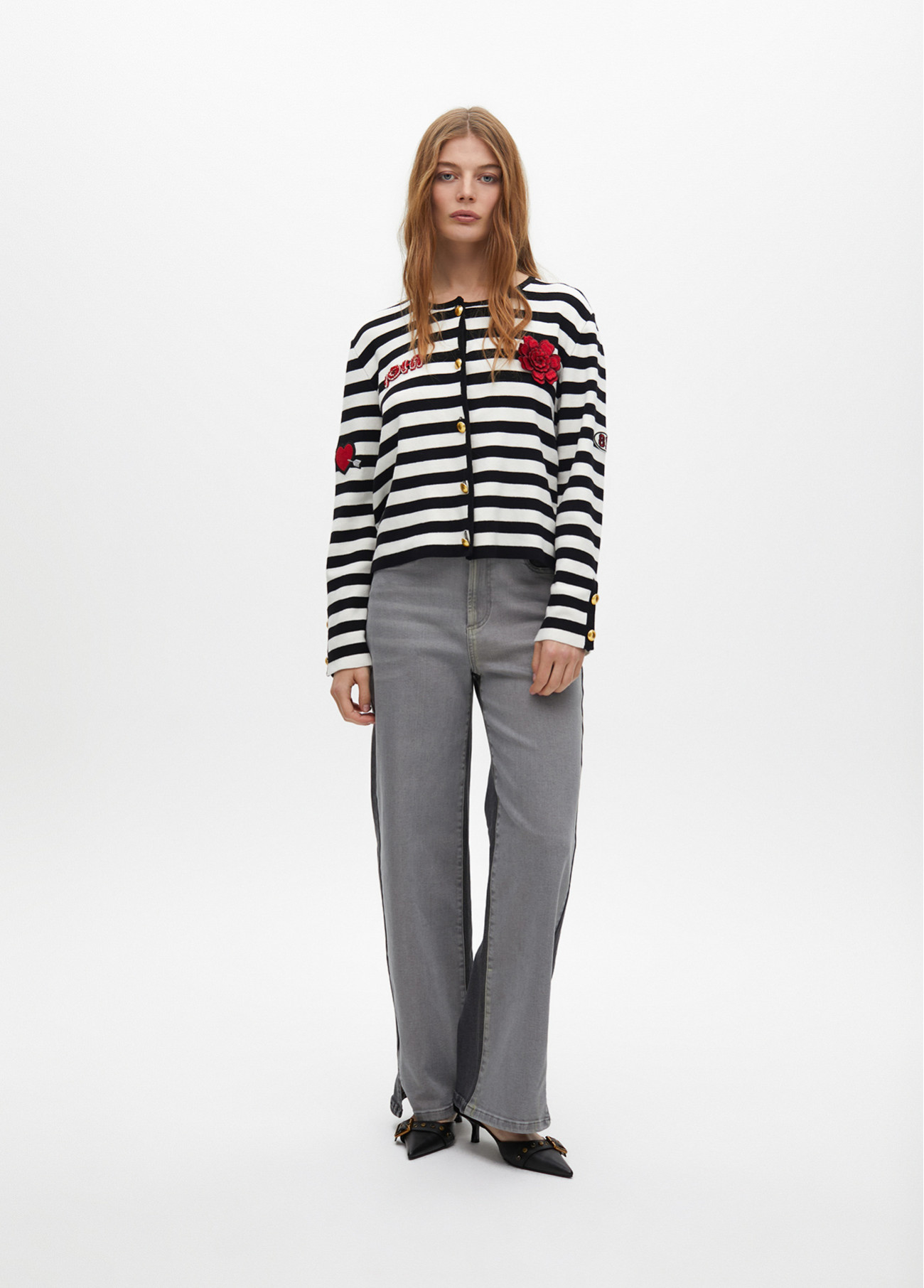 Cardigan em tecido de malha com design listrado e patches decorativos. Botões dourados na frente e detalhes de patches bordados. Manga longa e ajuste confortável.