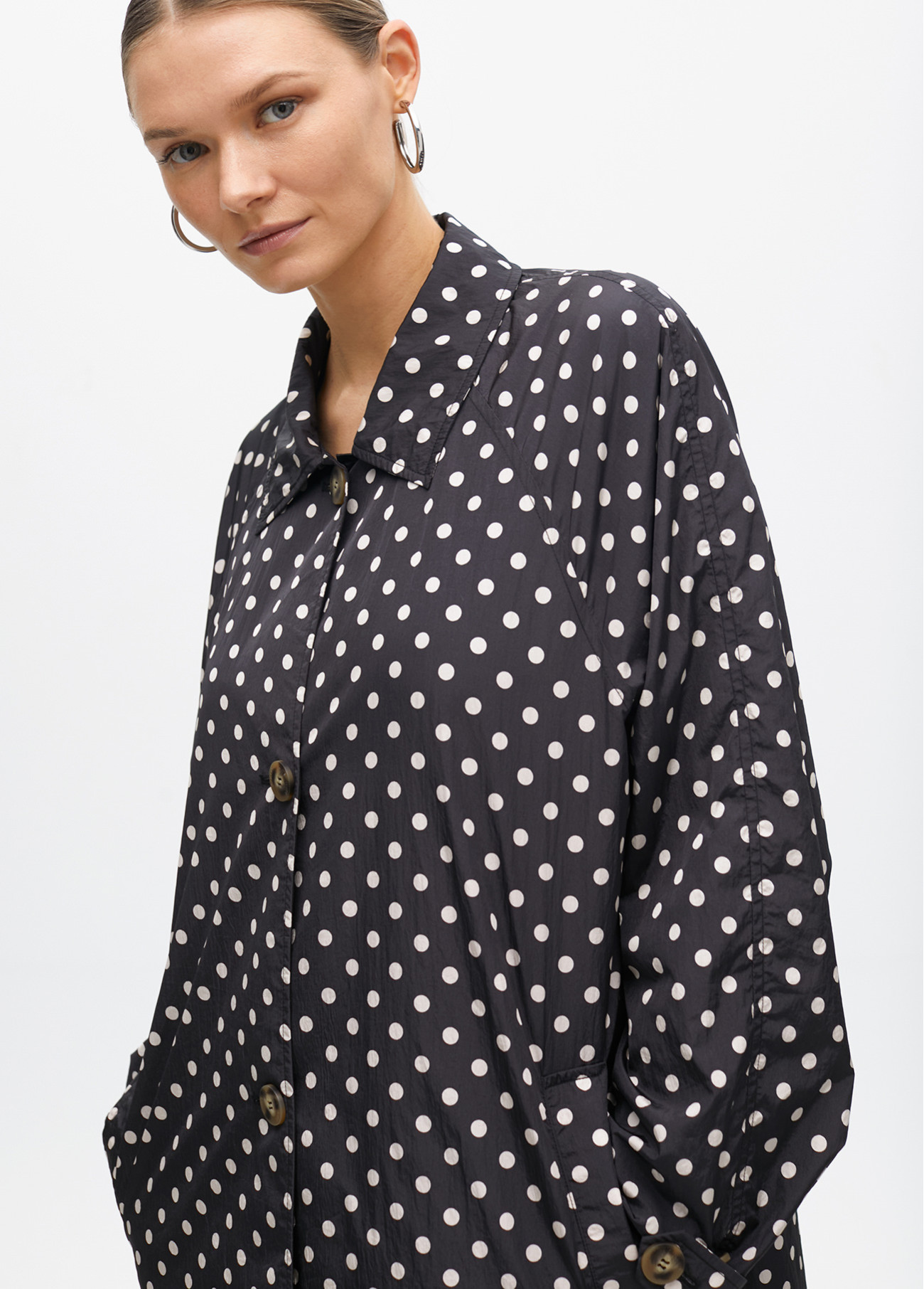 Parka leve e longa com estampa de bolinhas em fundo preto. Feita de tecido resistente ao vento. Botões frontais em contraste e lapelas clássicas. Mangas ajustáveis com botão para maior conforto. Bolsos laterais discretos.