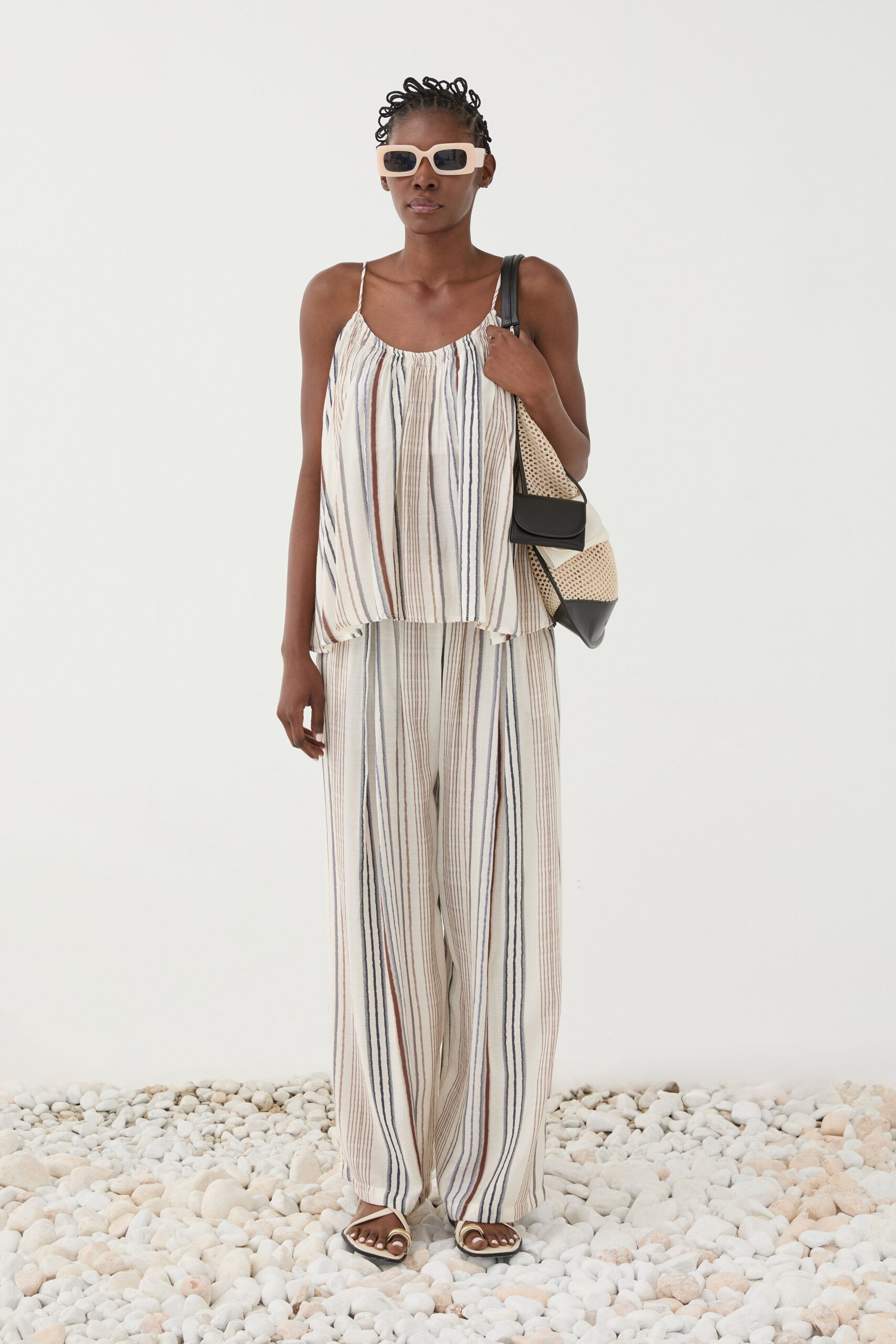 Este top de alças finas da Eleh é uma celebração da leveza e do detalhe. Com um padrão de riscas verticais em tons terrosos e azulados, esta peça evoca uma estética rústica e sofisticada, ideal para os dias mais quentes da estação.