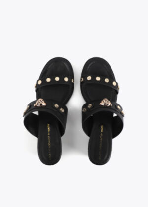 Sandália de salto com cabeça de leopardo e tachas