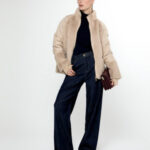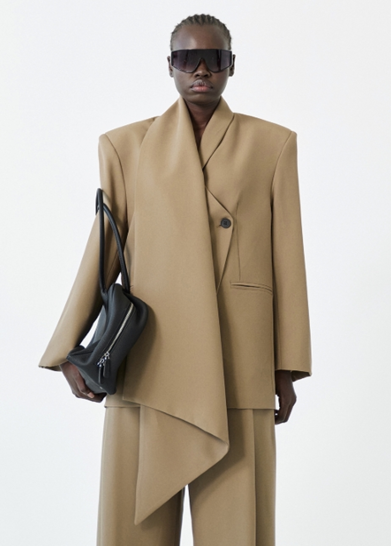 Blazer com um corte estruturado e linhas amplas, apresenta uma silhueta moderna que transmite força e refinamento. O design assimétrico na frente cria um efeito visual marcante, acrescentando movimento e originalidade à peça.