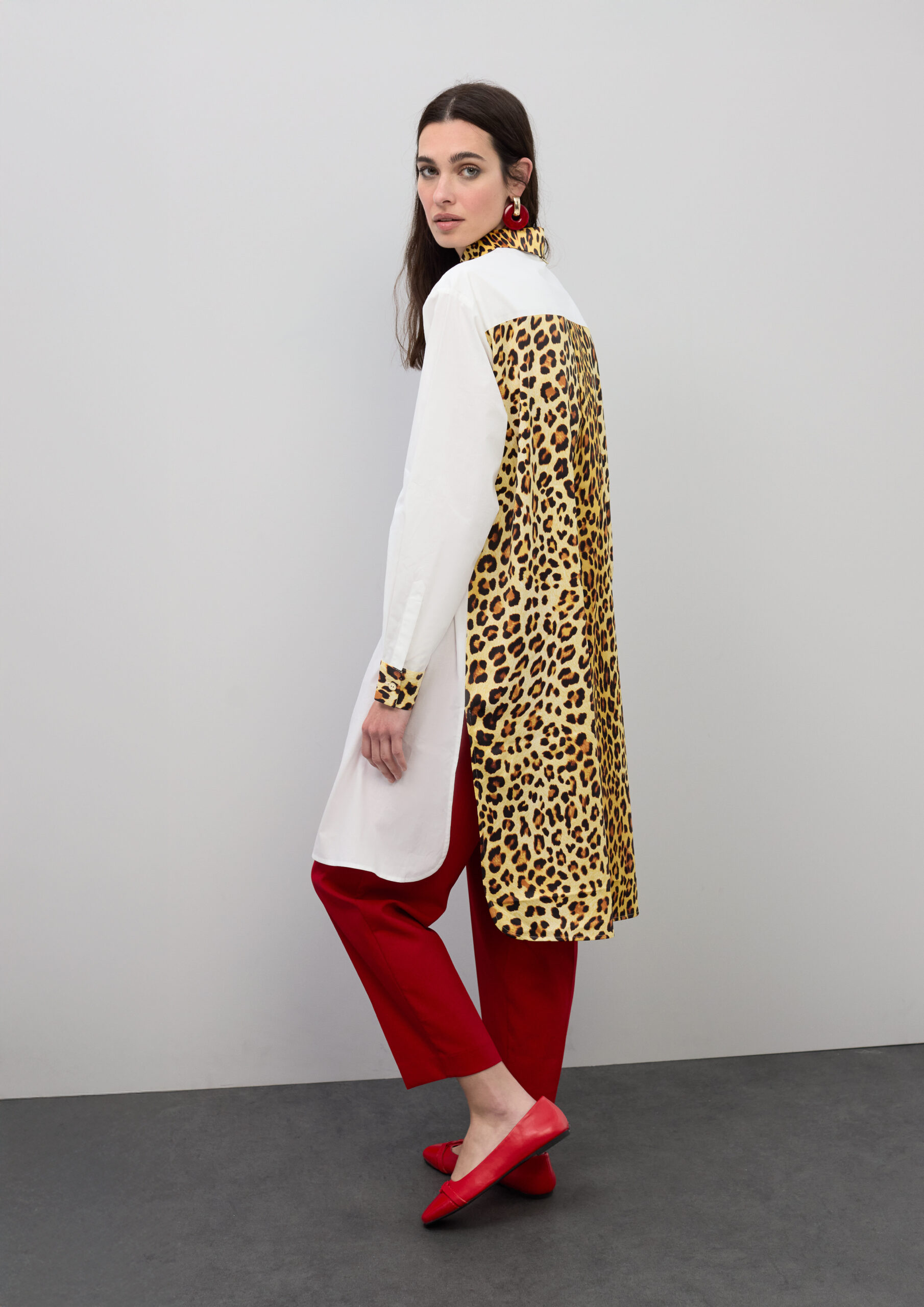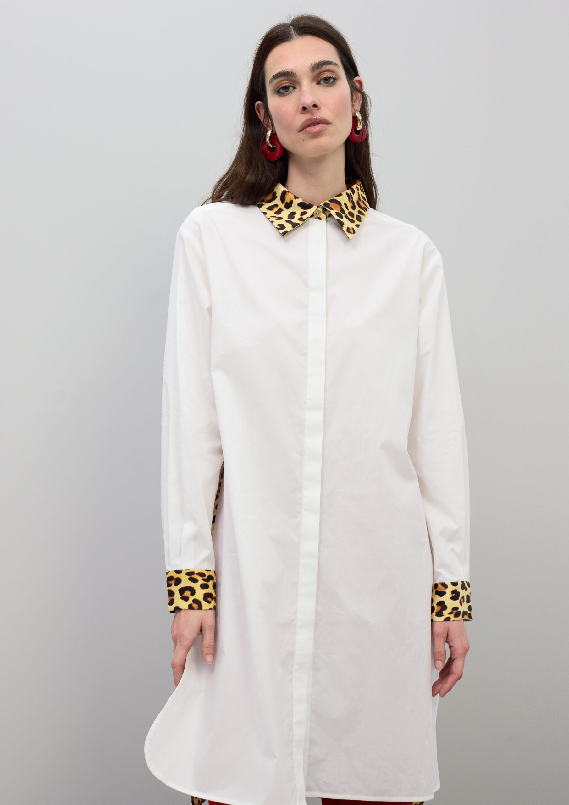 Blusão longo de popeline com contraste de estampa animal no colarinho e punhos. Seu design ousado e tecido leve o tornam ideal para um look impactante. Perfeito para combinar com calças de cores vibrantes.