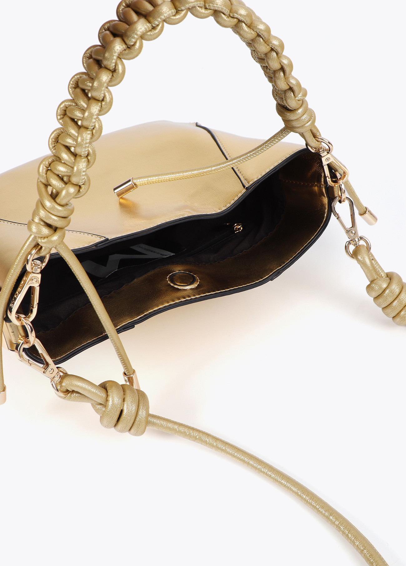 Elegante bolsa com efeito pele e alça trançada. Design em tom dourado brilhante com fecho magnético. Inclui compartimento interno com forro de tecido. Detalhe metálico decorativo na lateral, ideal para adicionar um toque sofisticado ao seu estilo.