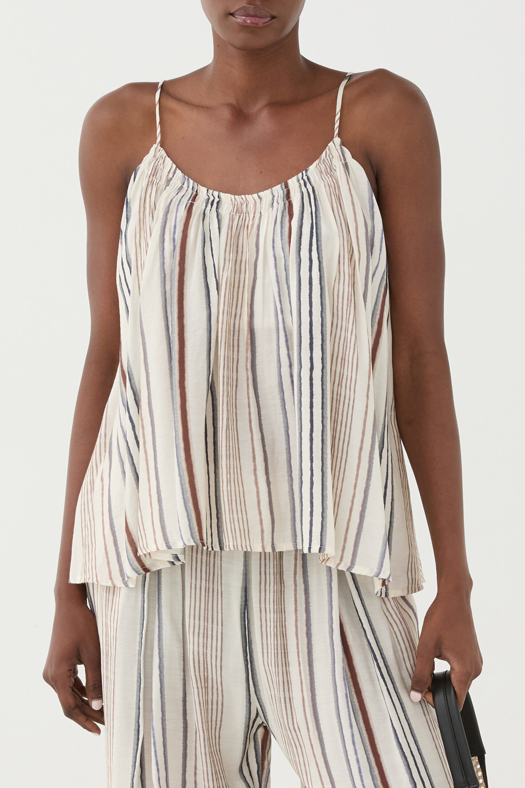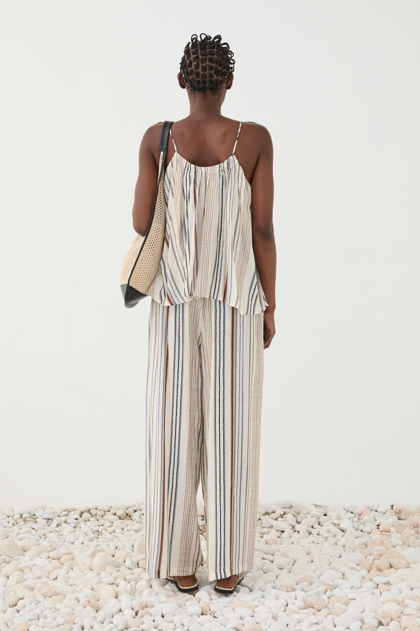 Crie um coordenado total e harmonioso com o Top evasé plissado com padrão linear Eleh