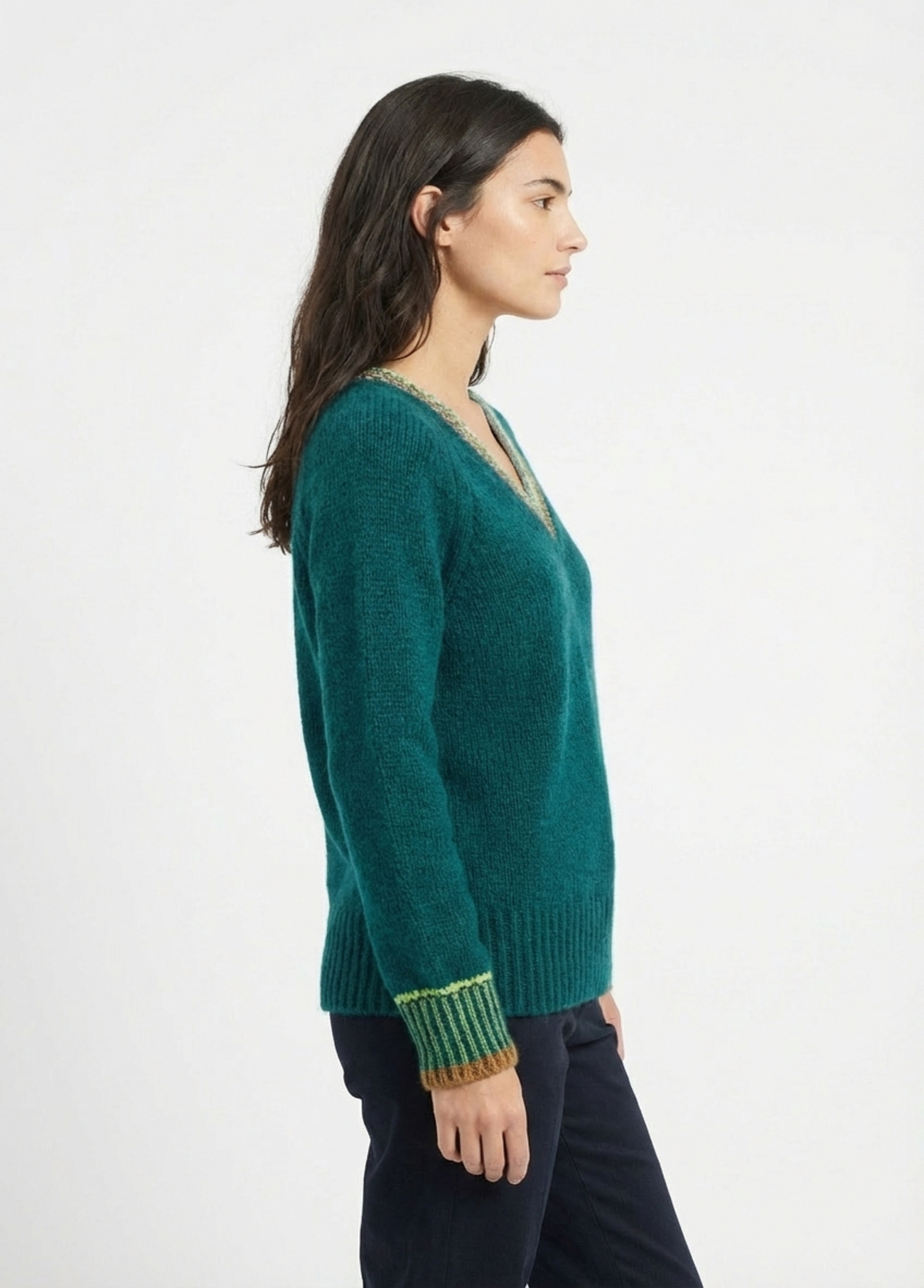 O decote profundo mas equilibrado é ideal para alongar visualmente o pescoço e o tronco, permitindo também o uso de acessórios delicados ou a sobreposição com camisas.