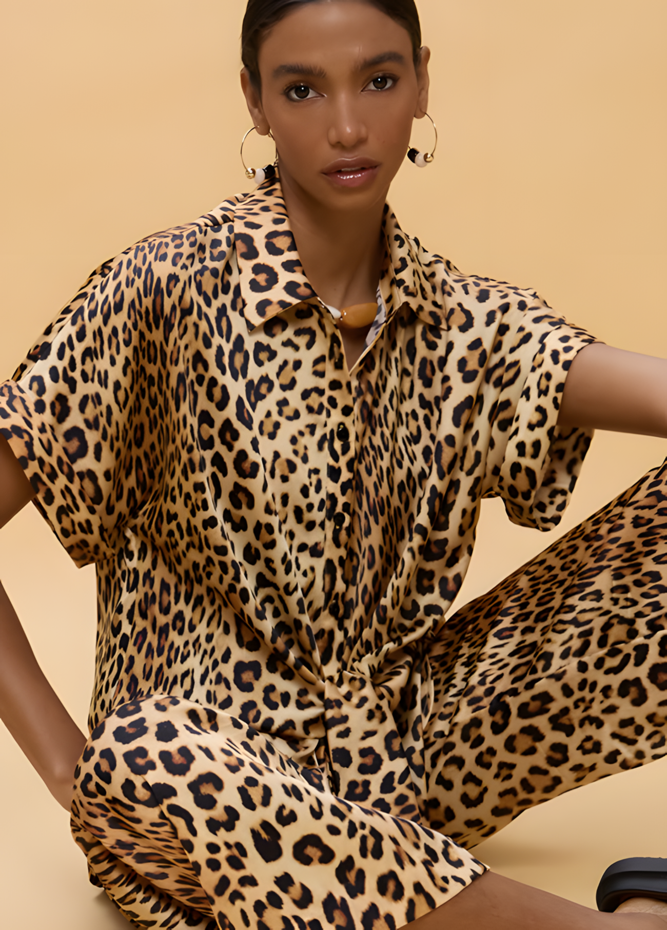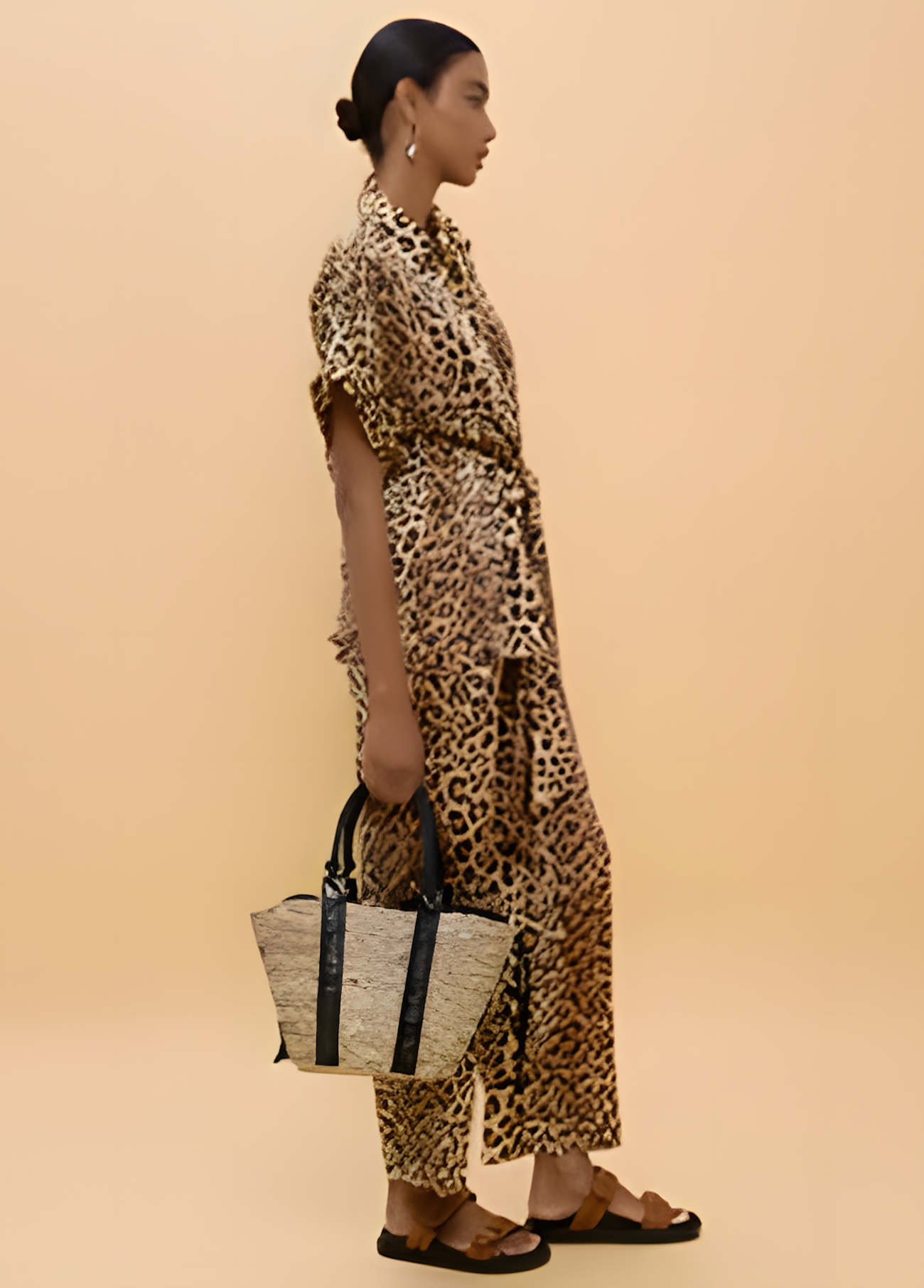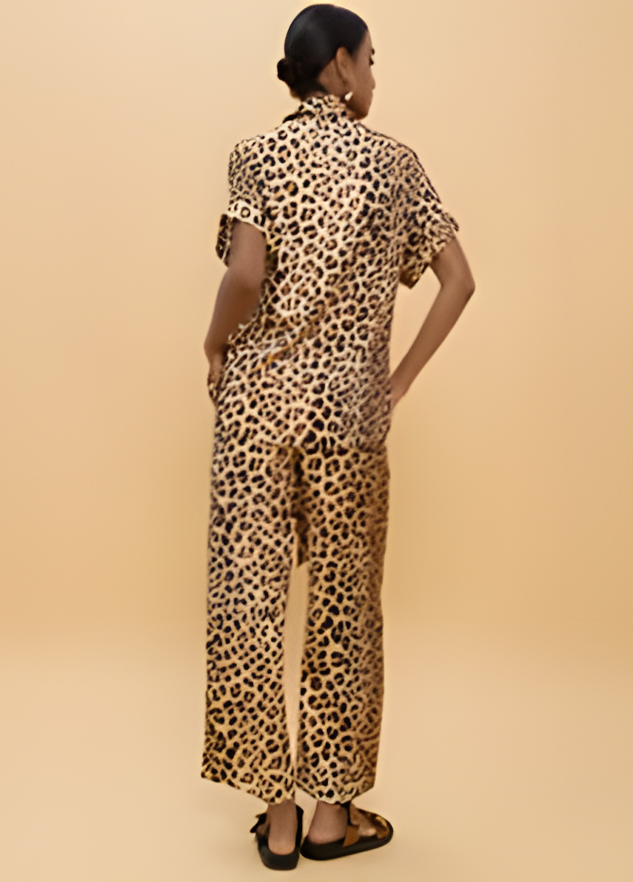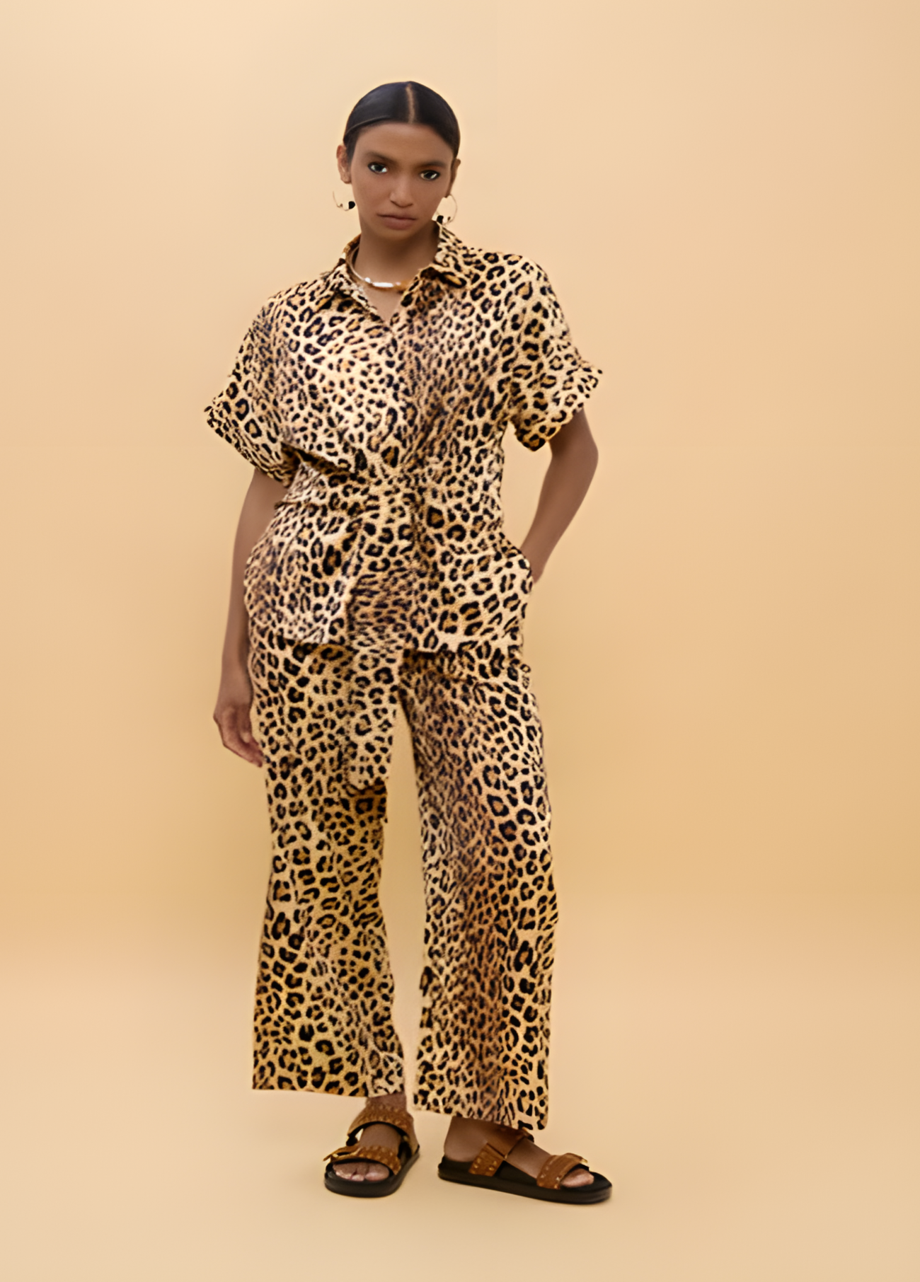 Estas calças de padrão animal print são a definição de conforto com estilo. Confeccionadas em viscose, garantindo um toque macio, leveza e um excelente caimento fluido. Possuem um corte de perna larga (wide leg) e comprimento ligeiramente acima do tornozelo, proporcionando um visual moderno e descontraído.A cintura de altura média/alta, ideal para combinar com a camisa a condizer para um “total look” impactante ou com uma t-shirt básica para um estilo mais casual.O padrão clássico animal print em tons de bege e preto torna-as uma peça atemporal e versátil para os dias mais quentes.