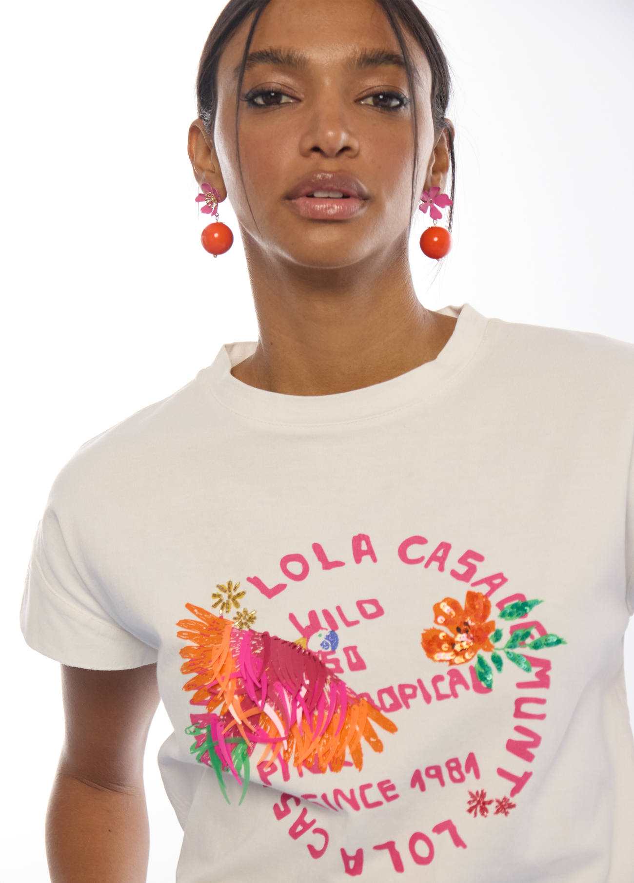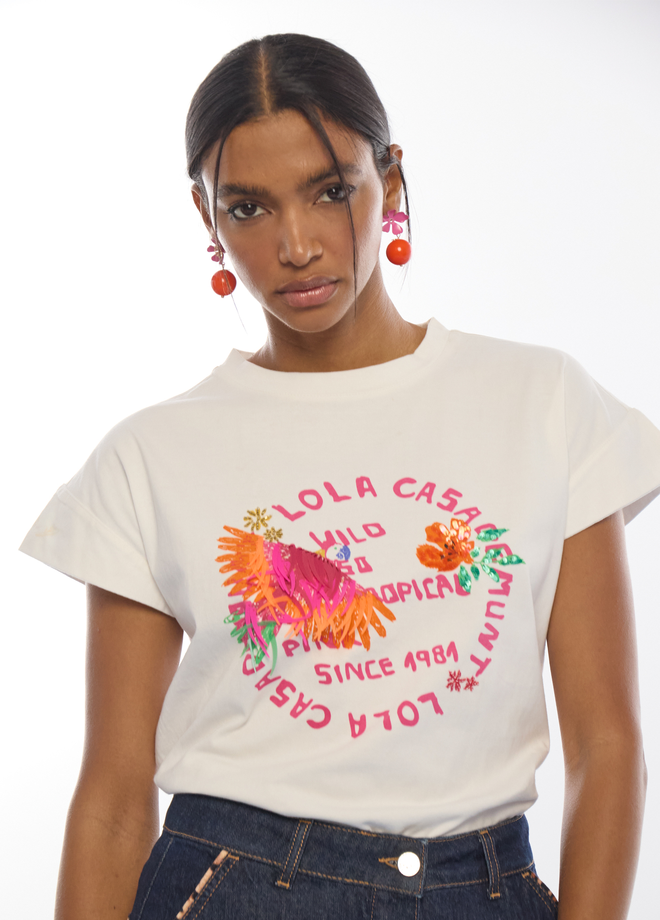 Esta t-shirt da Lola Casademunt é uma peça vibrante que combina o conforto do algodão com detalhes artesanais exóticos. É a escolha perfeita para quem procura um look casual, mas com um toque de personalidade “wild”.