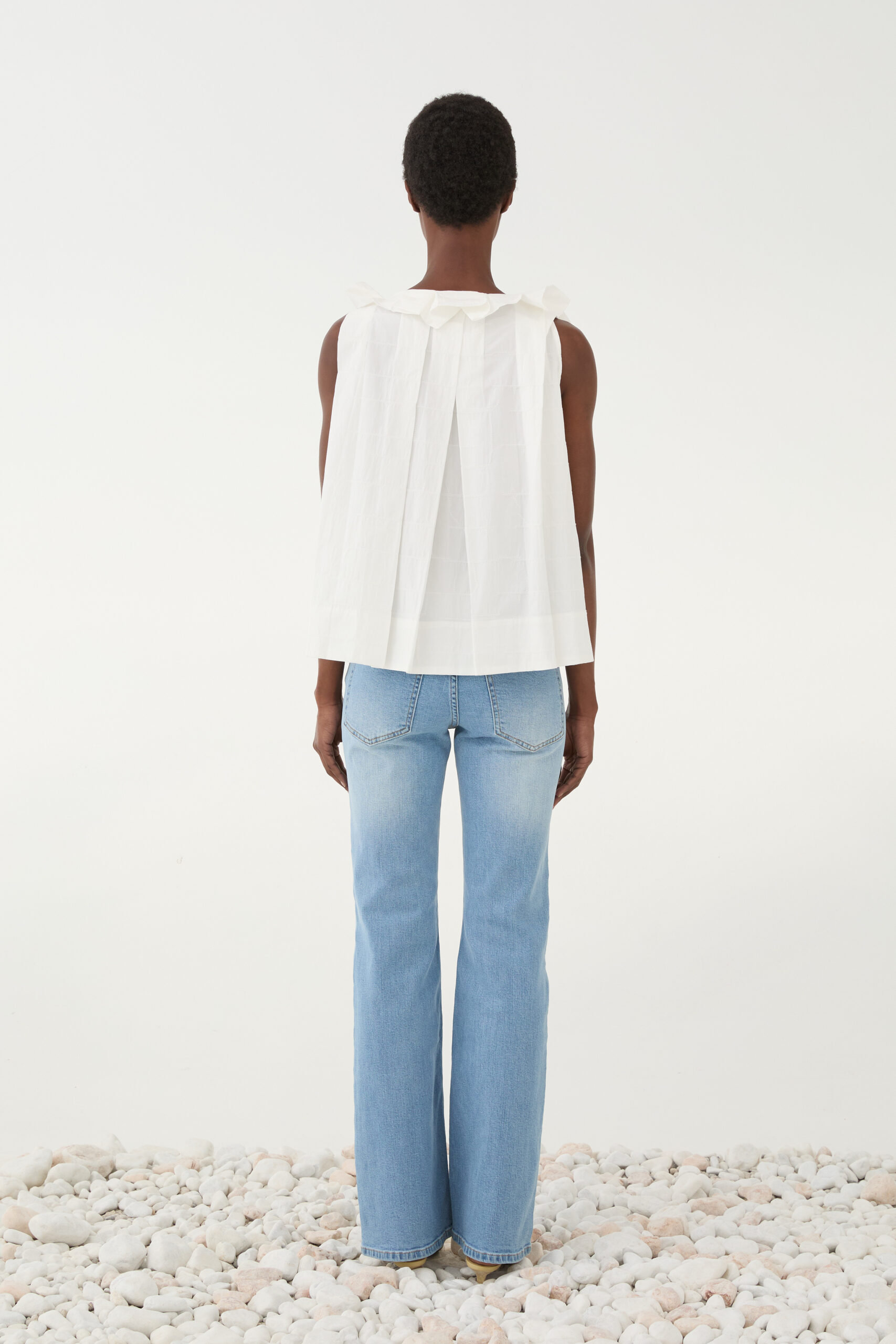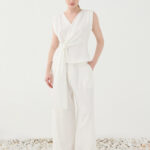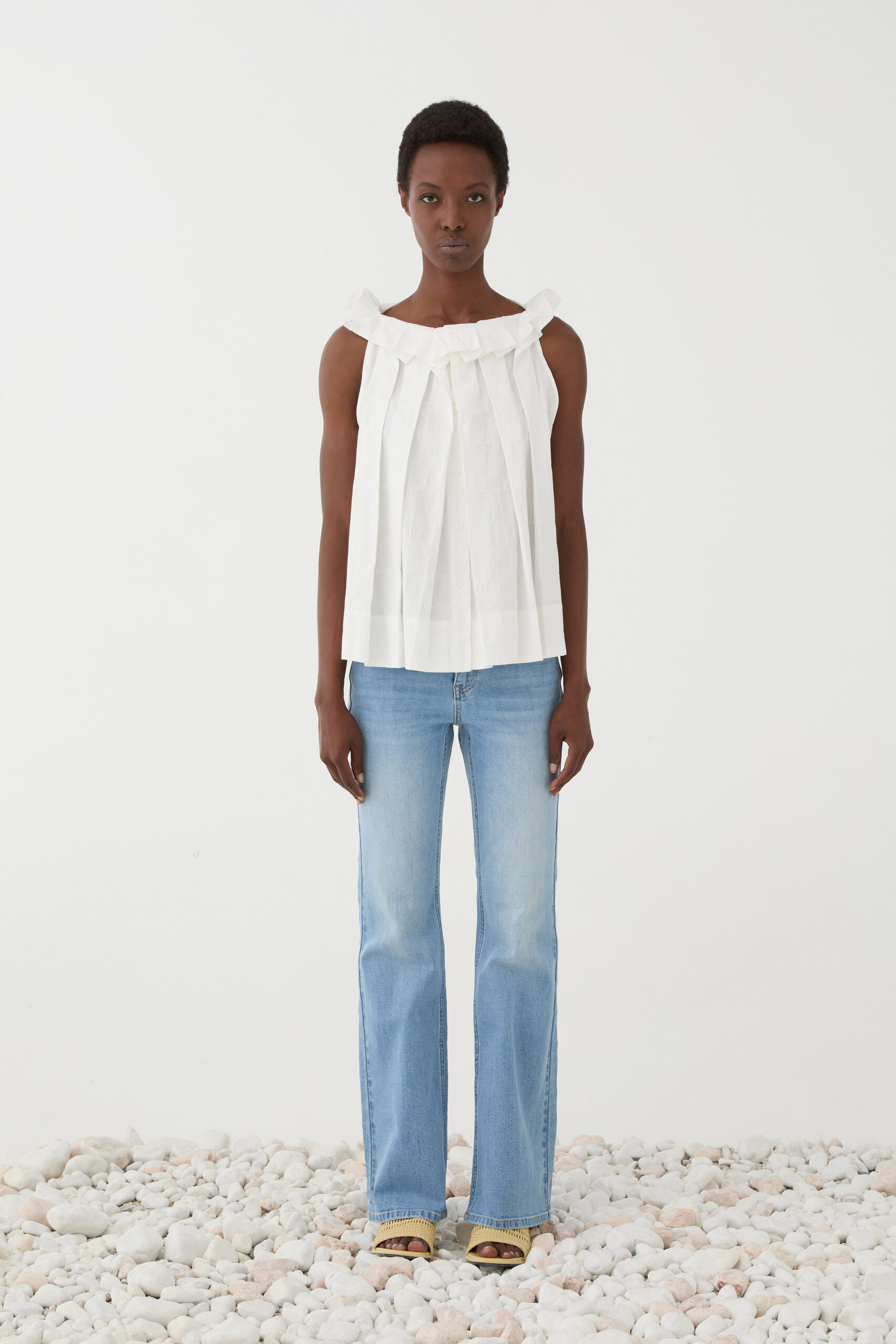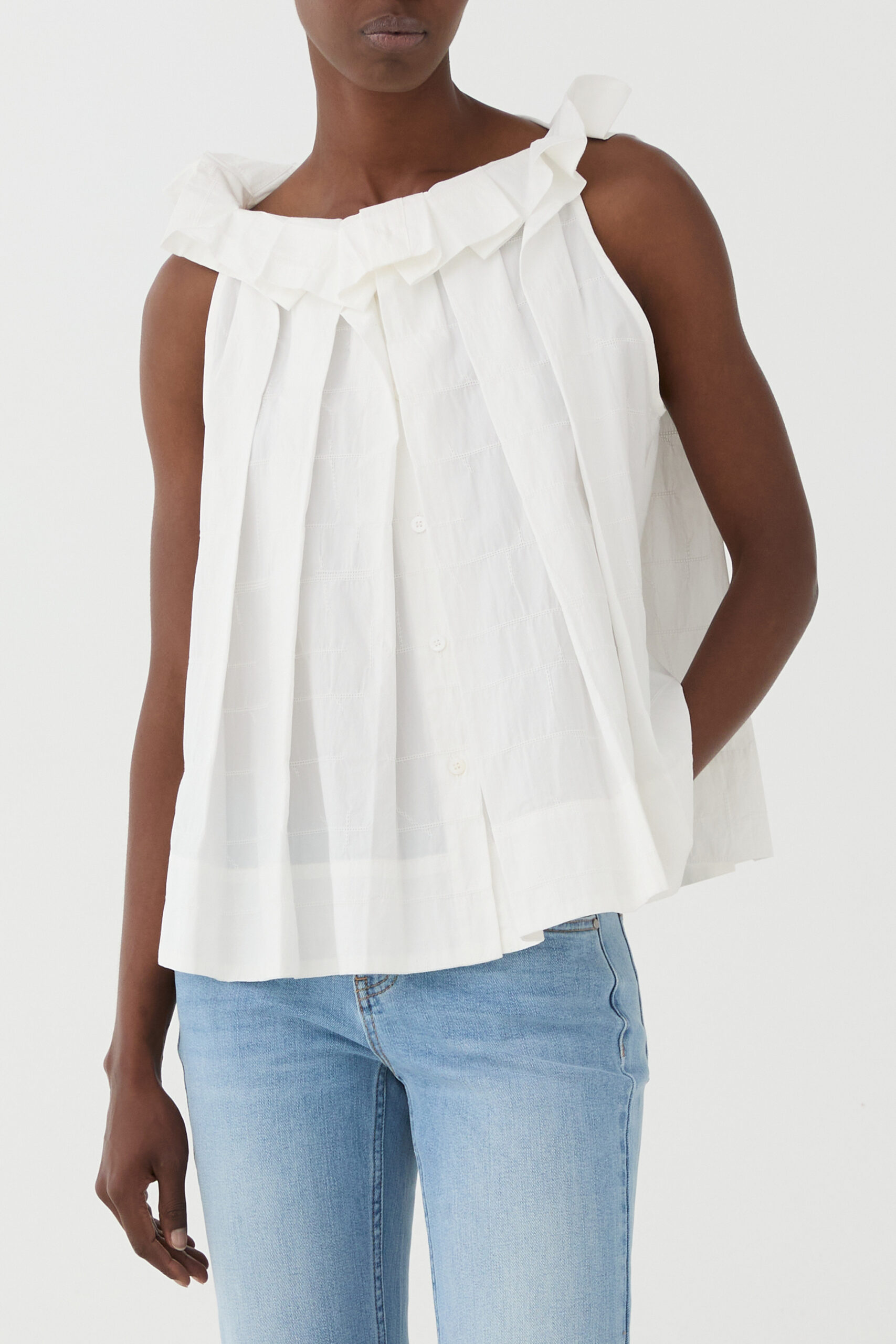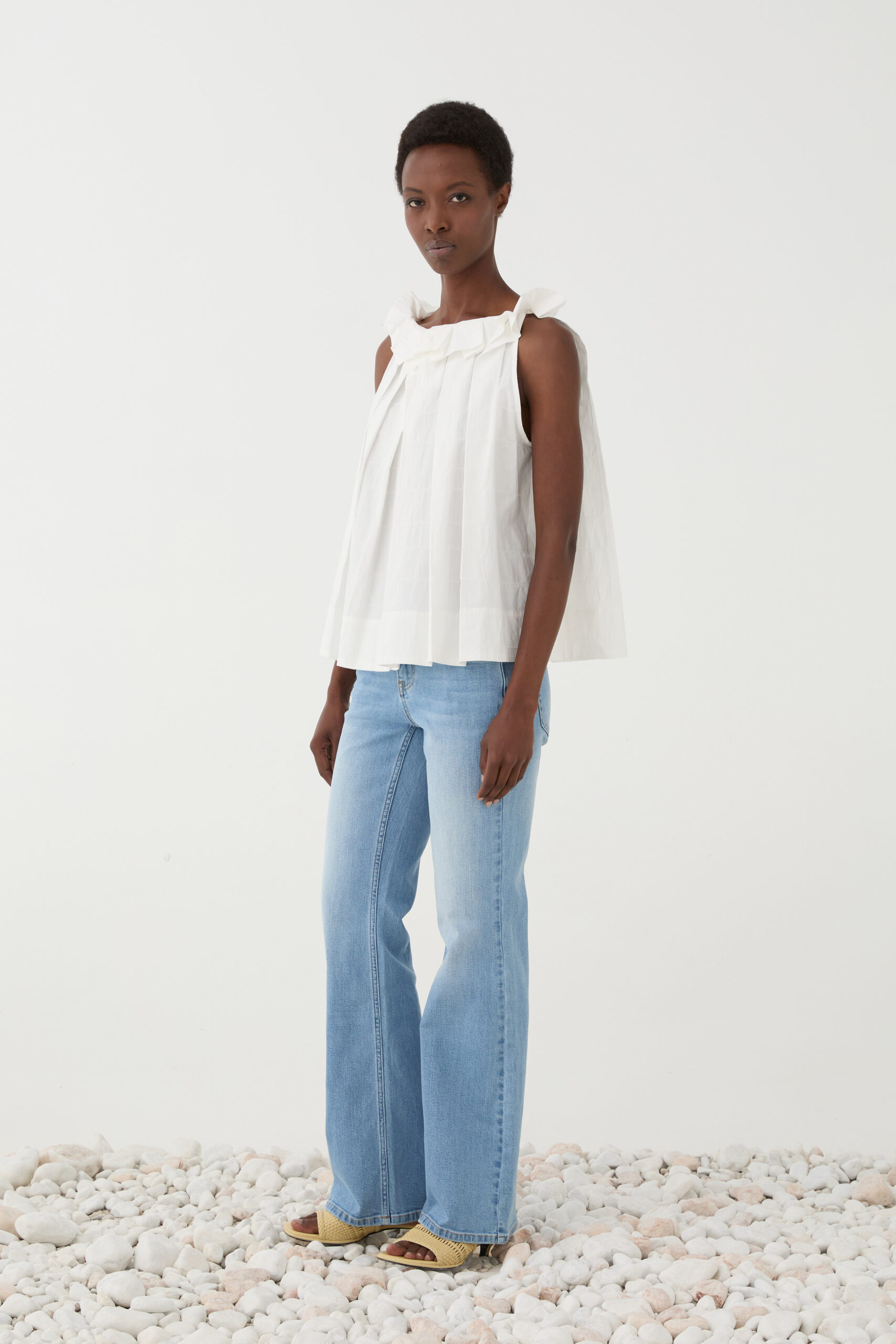 Eleve o seu guarda-roupa casual com o Top Eleh, uma peça que une a nobreza do algodão a um design contemporâneo e romântico. Com um corte evasê que prioriza o movimento, este top se destaca pelo decote adornado com babados volumosos e pregas frontais que conferem uma textura única e sofisticada.