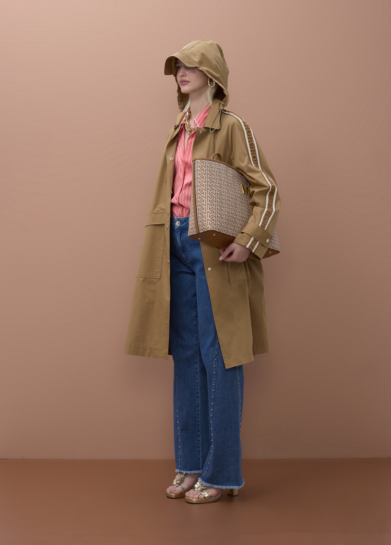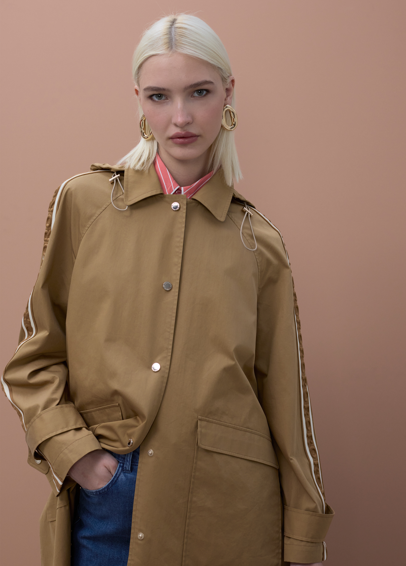 Redefina os seus looks de meia-estação com este trench coat de silhueta oversize em tom cáqui. Esta peça funde a funcionalidade clássica com o ADN arrojado da marca, destacando-se pelas fitas personalizadas com o logótipo que percorrem as mangas, conferindo um toque desportivo e moderno. Inclui um capuz prático, bolsos laterais generosos e um fecho frontal com botões, sendo a escolha perfeita para a mulher cosmopolita que valoriza o conforto sem abdicar do estilo.