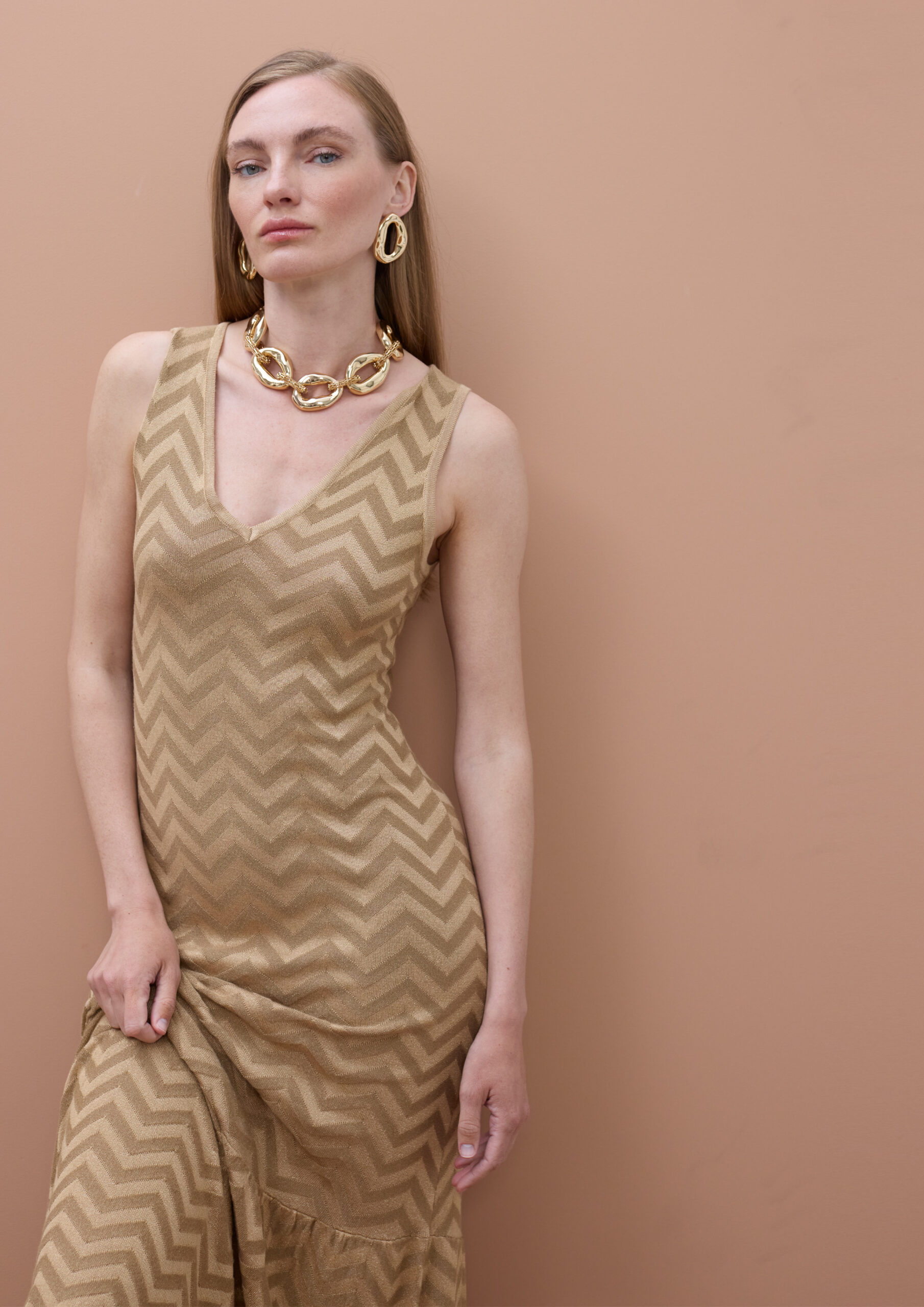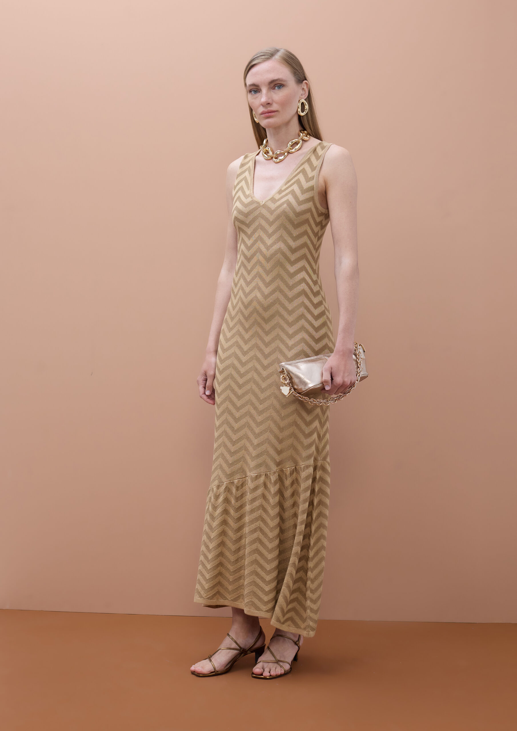 Este vestido da linha Lola Casademunt by Maite é uma celebração da textura e do movimento, concebido para uma mulher que procura uma elegância magnética e sem esforço. Eleve o seu estilo festivo com este deslumbrante vestido maxi, uma peça que combina o rigor do padrão geométrico com a delicadeza de detalhes românticos. O design destaca-se pelo seu padrão chevron rítmico em tons dourados e areia, criando um efeito visual que alonga e esculpe a silhueta. Com um sofisticado decote em V e design sem mangas, a peça culmina numa bainha de folhos fluida que confere um movimento etéreo a cada passo. Confeccionado num tricot leve e confortável, é a escolha perfeita para eventos que exigem uma sofisticação inata.